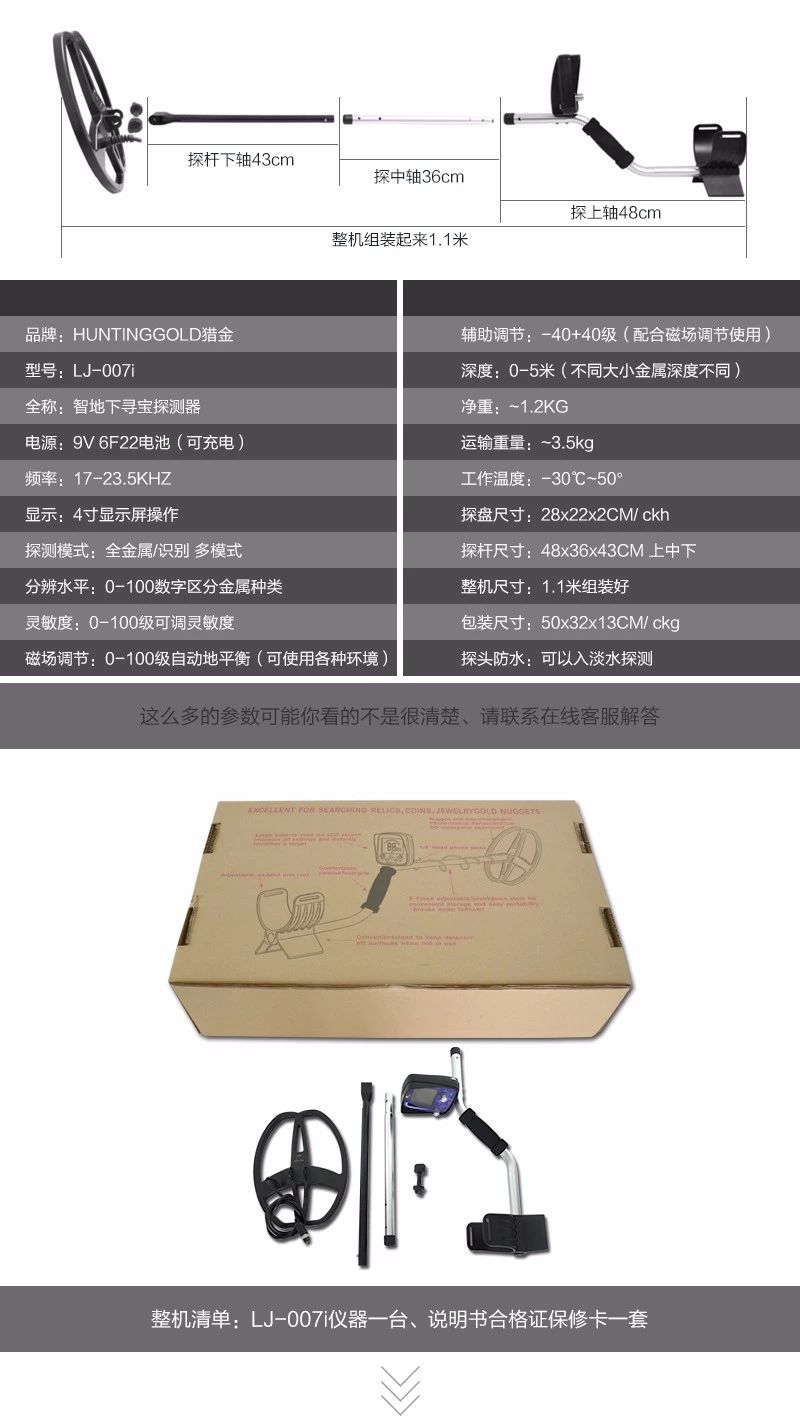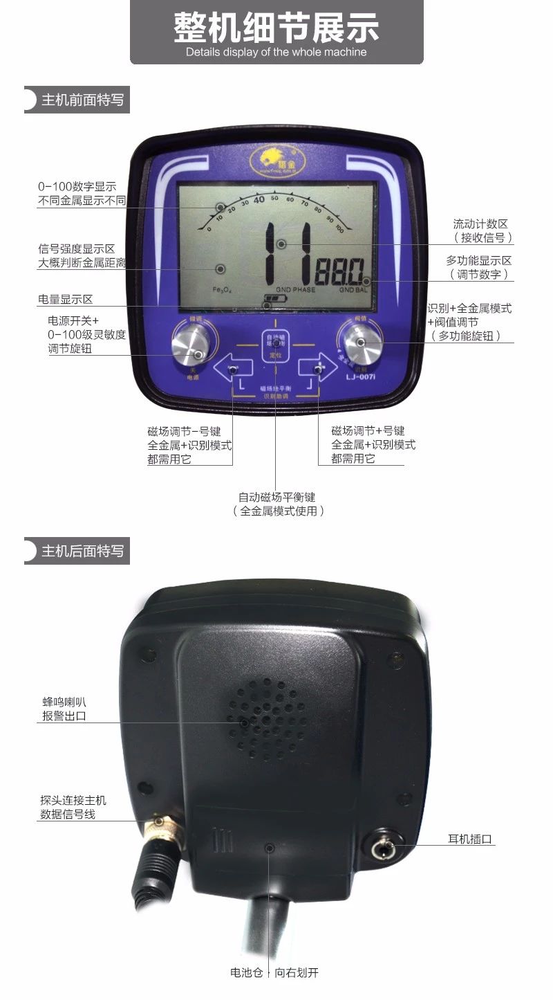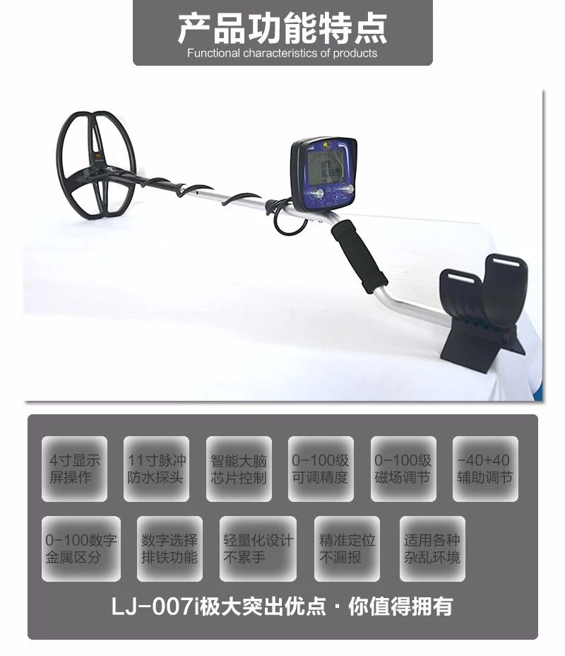 LJ-007i是一款高性能,智能的金屬探測器地下尋寶器,它集合了在電子儀器最新的技術,它的功能設計代表了金屬探測器技術的最前沿。LJ-007i更容易去學習使用,它組裝相對簡單、操作更加的簡單便捷。它的重量輕相比傳統的儀器更加出色。它非常出名于用在黃金、銀元、銅幣等古物探測上。獨有磁場調節功能在不同雜亂的環境下自動排除不掉的磁場可手動濾除,大大提高儀器的穩定靈敏性。